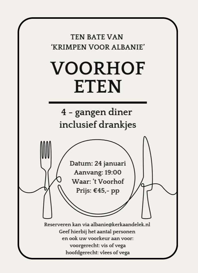 ![]() Op 24 januari zal ‘t Voorhof omgetoverd worden tot een luxueus restaurant waar u kunt genieten van een 4-gangen diner. Reserveren kan via albanie@kerkaandelek.nl. Geeft u hierbij aan met hoeveel personen u komt en wat u wenst als voorgerecht (vis/vega) en hoofdgerecht (vlees/vega). | ||